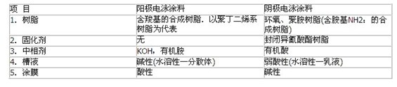 (2)陰極電泳涂料:陰極電泳涂料用的成膜聚合物是陽離子型樹脂,在樹脂骨架中含有多數(shù)的胺基.中和劑為有機(jī)酸,如甲酸、乙酸、乳酸等.陰極電泳涂料在水中離解成為陽離子的聚.合物,最常用的村脂有環(huán)氧樹脂和聚胺酯等.陽極電泳涂料和陰極電泳涂料組成的比較見下表.