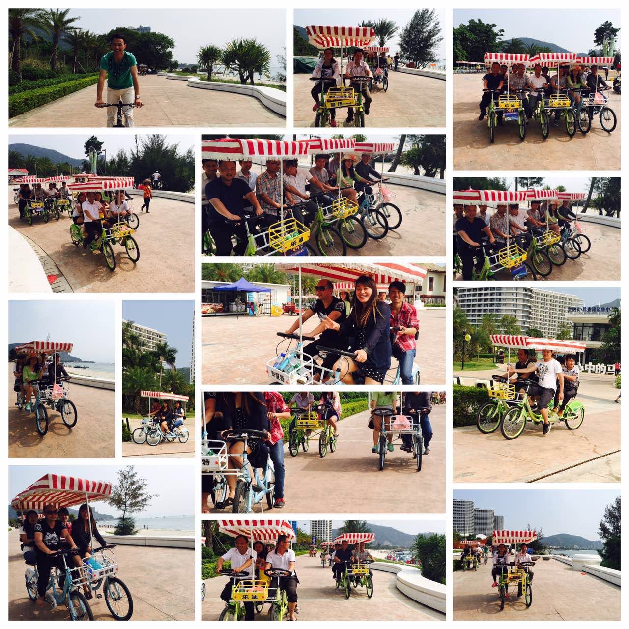 第二天一早大家便來到了素有中國式馬爾代夫之稱巽寮灣海灘邊,欣賞白沙灘,綠藍(lán)分明的海水,體驗了慢船在海中捕魚及快艇海中速度般飛越的感覺,大家都意猶未盡不舍上岸……拓展公司見我們都不愿意離開,簡單的午餐過后,組織了大家集體騎自行車環(huán)海觀光,一邊悠閑地踩著自行車,一邊吃著冰激淋,一邊吹著海風(fēng)和同事們嘻鬧,讓我們大家都開懷大笑!